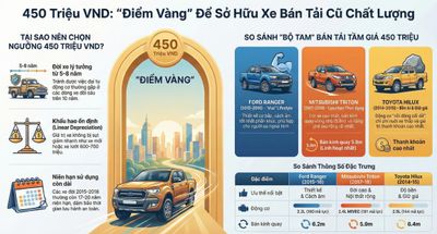 Lựa chọn xe bán tải cũ trong tầm giá 450 triệu không chỉ dựa trên thương hiệu mà còn phụ thuộc vào nhu cầu sử dụng thực tế và khả năng chấp nhận rủi ro về tuổi đời xe. Ba ứng cử viên sáng giá nhất - Ford Ranger, Mitsubishi Triton, và Toyota Hilux - mỗi dòng mang một "tính cách" riêng biệt, phục vụ các đối tượng người dùng khác nhau. Người thích ngoại hình cơ bắp, phong cách Mỹ và sẵn sàng chấp nhận chi phí bảo dưỡng cao hơn một chút sẽ nghiêng về Ranger. Người mua thực dụng, ưu tiên công năng, tiết kiệm nhiên liệu và không gian cabin rộng rãi cho gia đình sẽ chọn Triton. Còn người tìm kiếm sự an toàn tuyệt đối, độ bền lâu dài và giá trị thanh khoản cao khi bán lại sẽ đầu tư vào Hilux dù phải chấp nhận đời xe sâu hơn.
