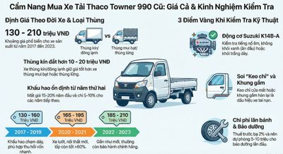 Hiện nay, giá xe tải Thaco Towner 990 cũ dao động từ 130 triệu đến 210 triệu đồng tùy thuộc vào năm sản xuất và tình trạng xe. Cụ thể, các đời xe từ 2017-2019 có mức giá khoảng 130-160 triệu đồng, trong khi xe lướt từ 2020-2022 giữ giá ở mức 170-200 triệu đồng. Sự chênh lệch giá phụ thuộc lớn vào loại thùng (thùng kín, thùng mui bạt hay thùng lửng) và chất lượng động cơ Suzuki K14B-A còn nguyên bản. Dòng xe này được đánh giá cao về khả năng giữ giá nhờ sử dụng động cơ công nghệ Nhật Bản (Suzuki K14B-A) với độ bền vượt trội so với các dòng máy Trung Quốc đời cũ. Mức khấu hao (Depreciation) điển hình của xe tải nhẹ (Light Commercial Vehicle) Thaco là khoảng 15-20% trong năm đầu tiên và 5-10% cho các năm tiếp theo, giúp xe duy trì giá trị đầu tư tốt hơn nhiều phân khúc tương đương.