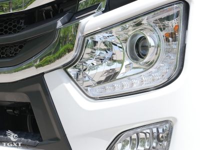 Mặt ca lăng kim loại tản nhiệt lớn mang phong cách mạnh mẽ. Cụm đèn pha Projector tích hợp LED ban ngày cung cấp cường độ sáng cao, cải thiện tầm nhìn cho tài xế chuyên nghiệp trong điều kiện thời tiết xấu. Đèn pha này vượt trội so với đèn halogen truyền thống ở khả năng chiếu xa và tập trung chùm sáng.