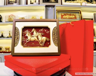 Trong số các mẫu tranh mạ vàng, tranh Mã đáo thành công mạ vàng 24K có lẽ là dòng sản phẩm được tìm kiếm nhiều nhất. Họa tiết ngựa phi - có thể là một con ngựa đơn lẻ, ba ngựa hoặc tám ngựa (bát mã) - mang trong mình thông điệp mạnh mẽ về sự thành công nhanh chóng và sự nghiệp thăng tiến.